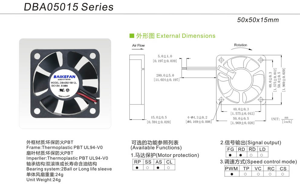 BAIKEFAN DBA05015B12L DC12V 0.06A 兩線 5015散熱風扇