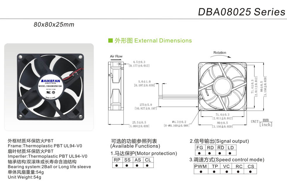 BAIKEFAN DBA08025B12M DC12V 0.18A 2線 8025 散熱風扇TEL:13910098771